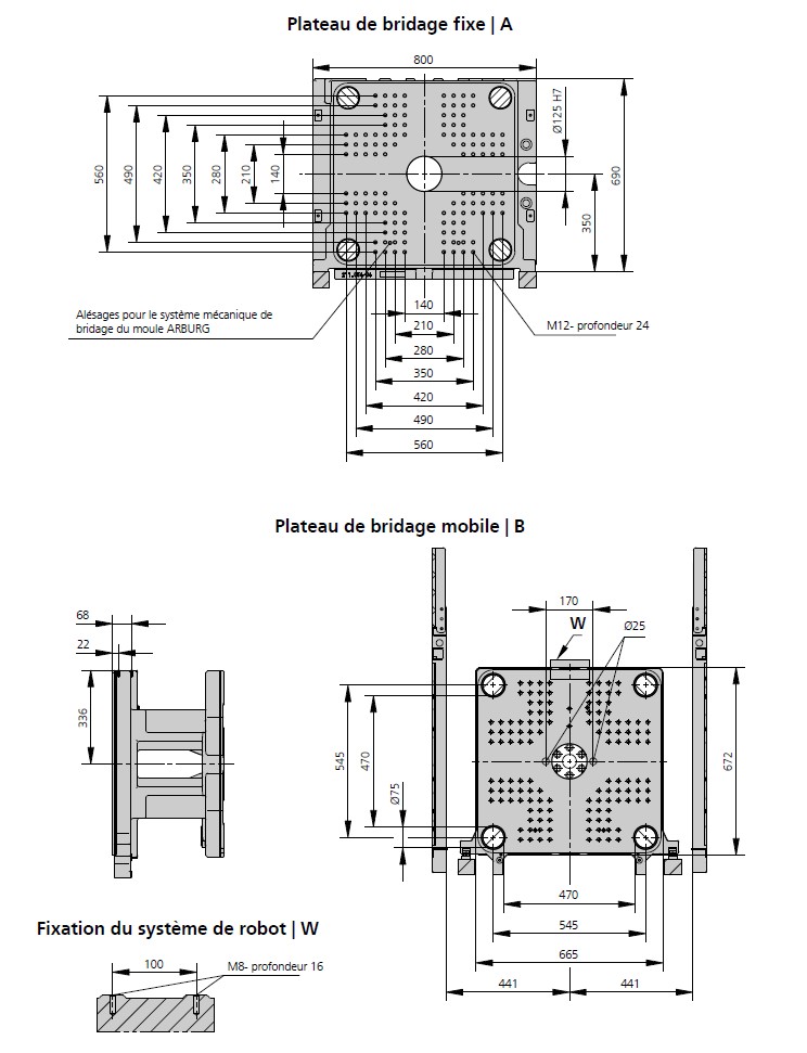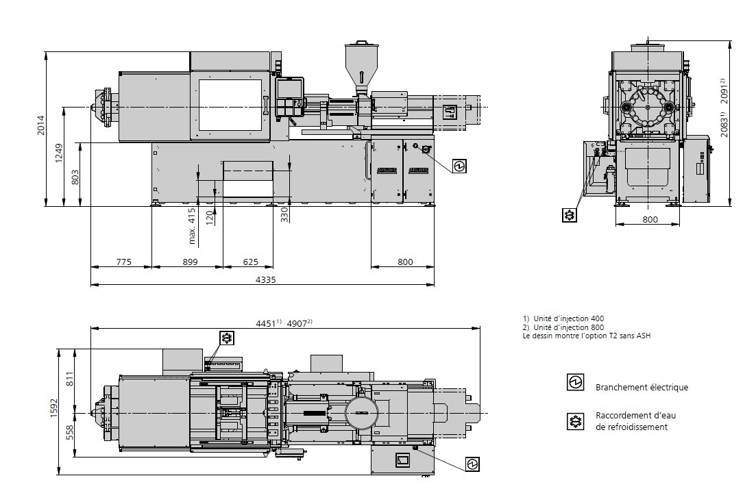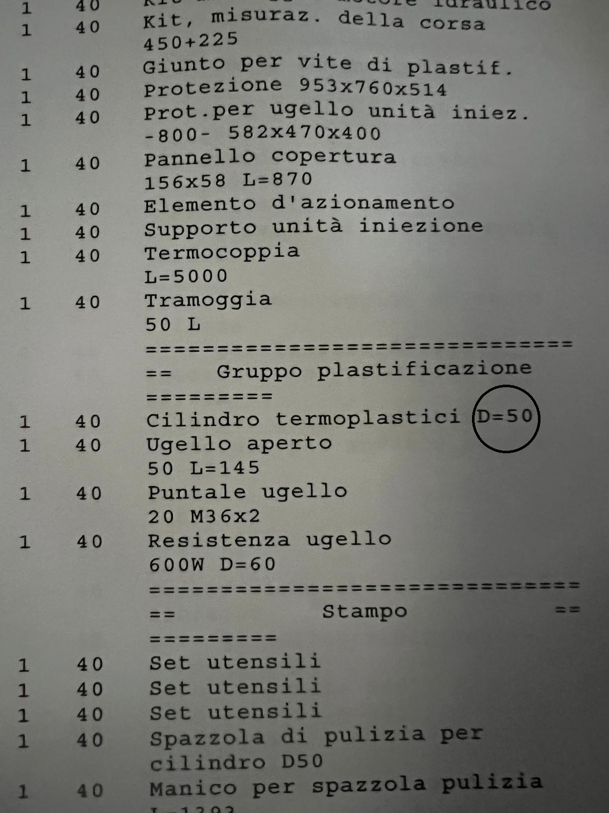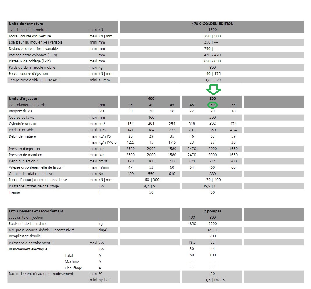Forza chiusura: 1500 Kn ( 150 ton) Corsa apertura: 500 mm Distanza tra le piastre: 750 mm Distanza tra le colonne: 470 x 470 mm Piastra porta stampo (LxH): 650 x 650 mm Estrazione: Idraulica Corsa estrazione max: 175 mm Forza estrazione: 40 Kn Olio serbatoio: 200 Lt Gruppo iniezione: 800 Diametro vite: 50 mm Lunghezza vite L/D: 20 L/D Volume max: 392 cm3 Portata iniezione: 214 max cm3/s Peso iniettabile max: 359 g/ps pressione esercizio: 2000 bar max Peso: 5200 Kg Ingombro: 4907x1592x2083 mm
