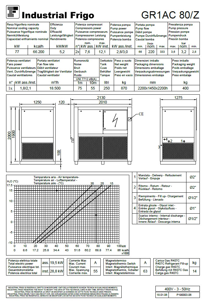 GAS:R407C (14KG) RESA FRIGORIFERA NOMINALE: 77 KW - KCAL/H 66.200 PESO MACCHINA: 825KG