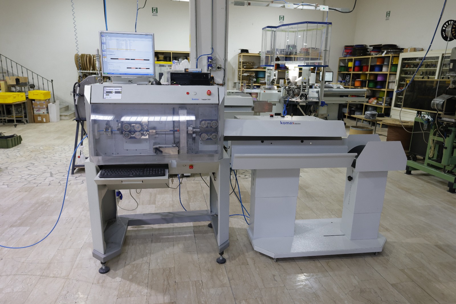 La macchina per il taglio e la spelatura Kappa 350 lavora conduttori rotondi fino a 120 mm² e un diametro esterno massimo di 35 mm in alta qualità grazie a sofisticati sensori. Kappa 350 è una centrale elettrica: la macchina per il taglio e la spelatura è estremamente economica grazie a una robusta trasmissione a cinghia o a rulli opzionale con una velocità di trasporto del filo di 4,8 m/s, una ripetibilità precisa e la testa di taglio con due posizioni della lama. Sensori innovativi supportano il lavoro di configurazione e si occupano del controllo qualità durante il funzionamento per ridurre al minimo le perdite di taglio. I collegamenti standardizzati facilitano l'integrazione di moduli aggiuntivi come sistemi di alimentazione del filo, stampanti, vassoi attivi, ecc. TopWin può essere utilizzato anche per produrre elenchi completi di parti, sequenze come set multiconduttore o come cablaggio. Il software consente inoltre l'etichettatura dei cavi, il collegamento alla rete aziendale e la stampa delle bolle di spedizione delle merci MACCHINA PERFETTAMENTE FUNZIONANTE IN OTTIMO STATO COMPLETA DI ACCATASTATORE