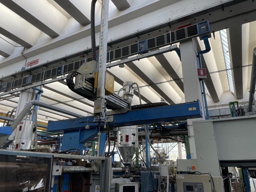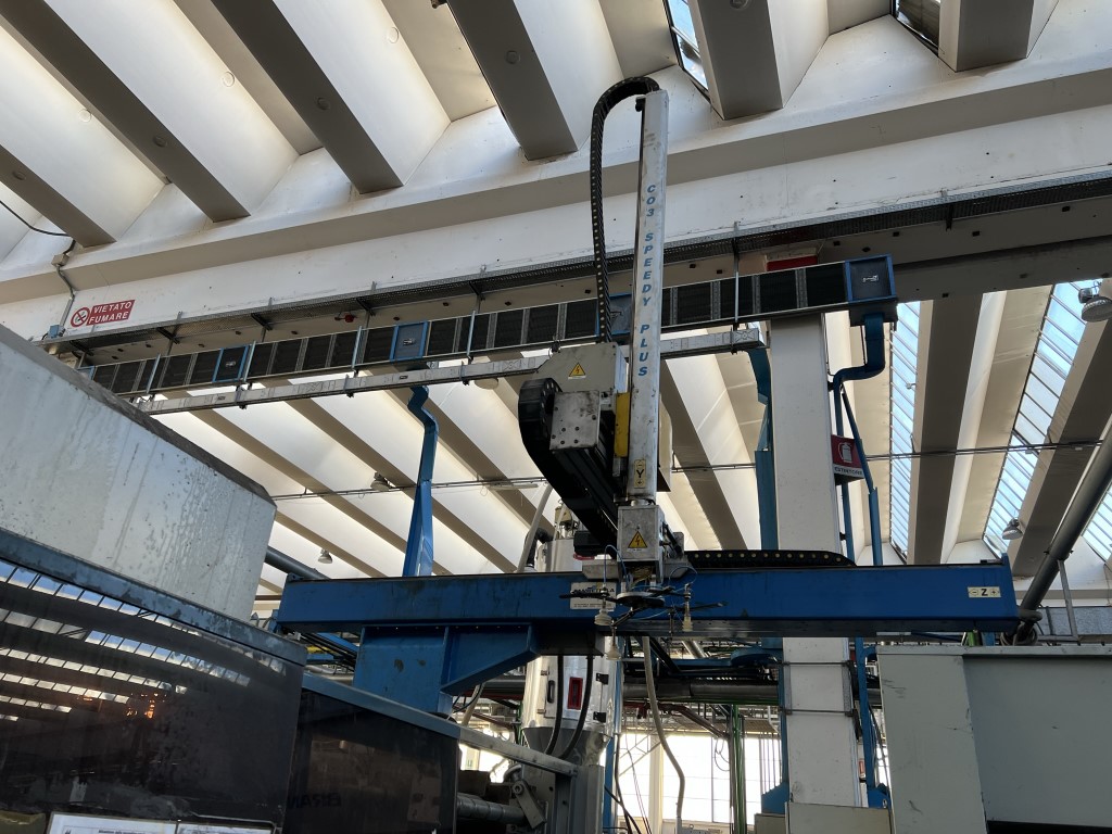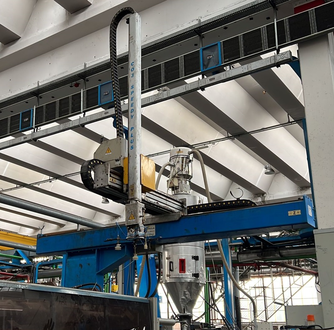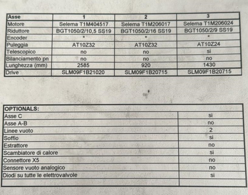 asse X: ROVESCIATO Asse z: Lunghezza mm 2585 utile ( 3020 mm) Asse x: 920 mm Asse y: 1430 mm ( telescopico) Motori: selema Drive: SLM09F1B21020/SLM09F1B20715 Asse ribaltamento: 0-90 pneumatico attualmente mancante di video ( in riparazione)