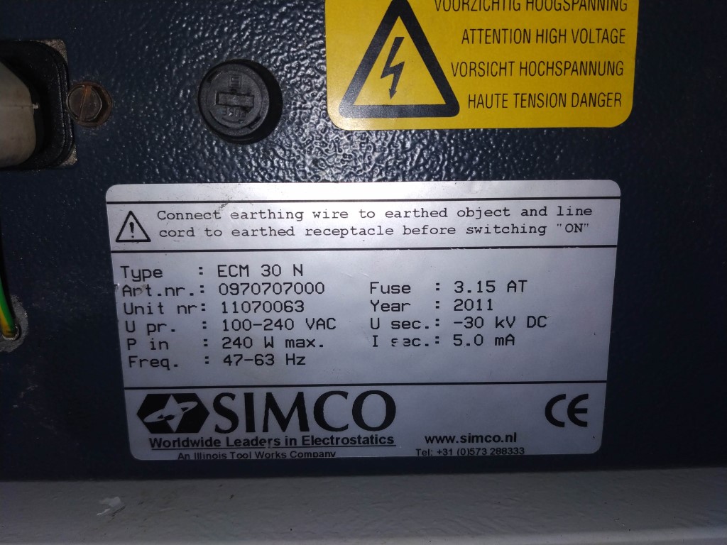 Banco caricaemento etichette completo di: generatore di carica elettrostatica SIMCO ECM.